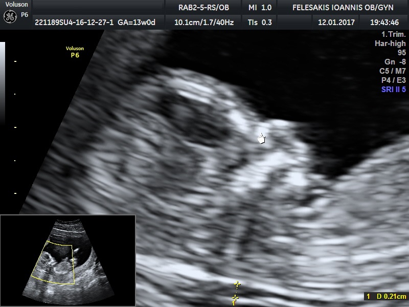 Το υπερηχογράφημα αυτό πραγματοποιείται μεταξύ 11 και 13+6 εβδομάδας συνήθως διακοιλιακά. Ελέγχεται η ανάπτυξη του εμβρύου, η ανατομία του και προσδιορίζεται η πιθανότητα για χρωμοσωμικές ανωμαλίες όπως το Σύνδρομο Down (Τρισωμία 21), σύνδρομο Edwards (Τρισωμία 18), Patau (Τρισωμία 13). Η ηλικία της μητέρας, υπερηχογραφικές μετρήσεις και βιοχημικές παράμετροι συνυπολογίζονται από ένα πρόγραμμα το οποίο παρέχεται στους πιστοποιημένους ιατρούς για τη διενέργεια της αυχενικής διαφάνειας από το Fetal Medicine Foundation. Πρωτοπορος της μεθόδου αυτής είναι ο καθηγητής Κύπρος Νικολαΐδης ιδρυτής του Fetal Medicine Foundation ( King's College Hospital- Λονδίνο - Ηνωμένο Βασίλειο)